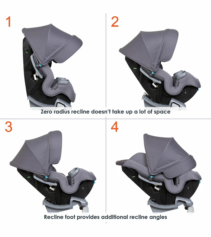 - Recline Readiness: The base has a Zero Recline Radius that adjusts to three rear facing positions, two forward facing positions, allows front seat passengers to have extra legroom and is easy to access. An integrated recline flip foot is also available to offer dual adjustment and gives the right angle with ease.