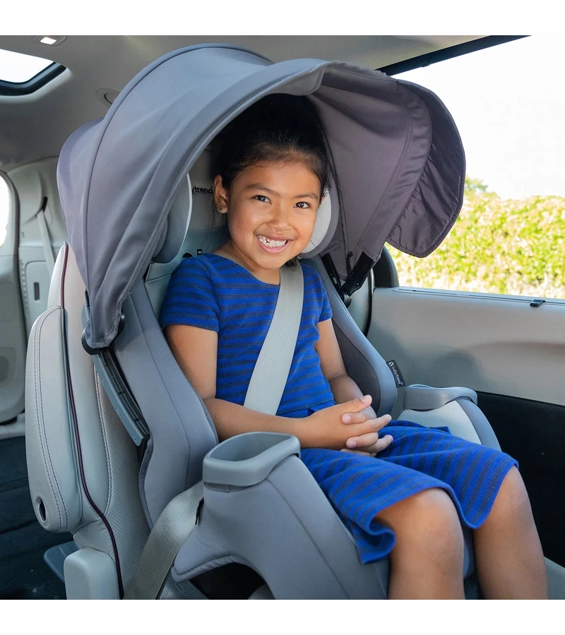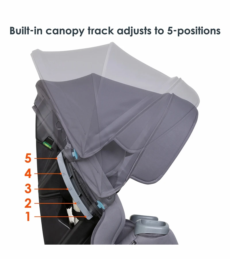 Introducing the Baby Trend CoverMe™ 4-in-1 Convertible Car Seat! In our study involving 400+ moms currently using convertible car seats, the #1 complaint about their convertible is children irritated by sunlight in the cars. The CoverMe™ has an integrated patented height and angle adjustable UPF 50+ canopy for full in-car shade protection. The canopy is integrated and attached on a built-in track so it’s easy to adjust and remove. Flip-out side visors provide extra shade protection for kids when the car is in motion and the sunlight’s coming from multiple directions.