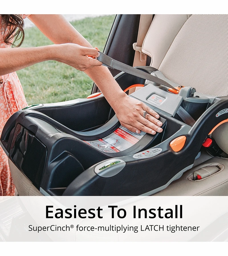 Two RideRight™ bubble level-indicators and the ReclineSure™ spring-loaded leveling foot help verify and achieve proper angle in the vehicle seat. The base is also equipped with premium LATCH connectors for easy attachment and removal from the lower anchors in the vehicle seat. The one-pull SuperCinch® tightener applies force-multiplying technology for a secure fit with a fraction of the effort.