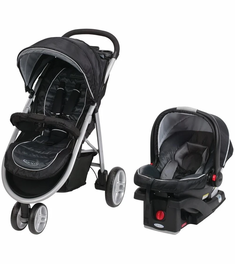 Graco’s Aire3 Click Connect Travel System is designed to make it extra-easy for you to explore with baby. The sleek, lightweight stroller weighs less than 21 lbs. so it’s easy to lift and carry, and the 3-wheel design is easy to maneuver. It folds with one hand and automatically stands for simple storage. The multi-position, flat-reclining seat is comfortable as your child grows. A parent’s tray with zippered storage and two cupholders, and an extra-large storage basket makes strolling more convenient for mom. It also includes the best-selling Graco SnugRide Click Connect 35 Infant Car Seat.