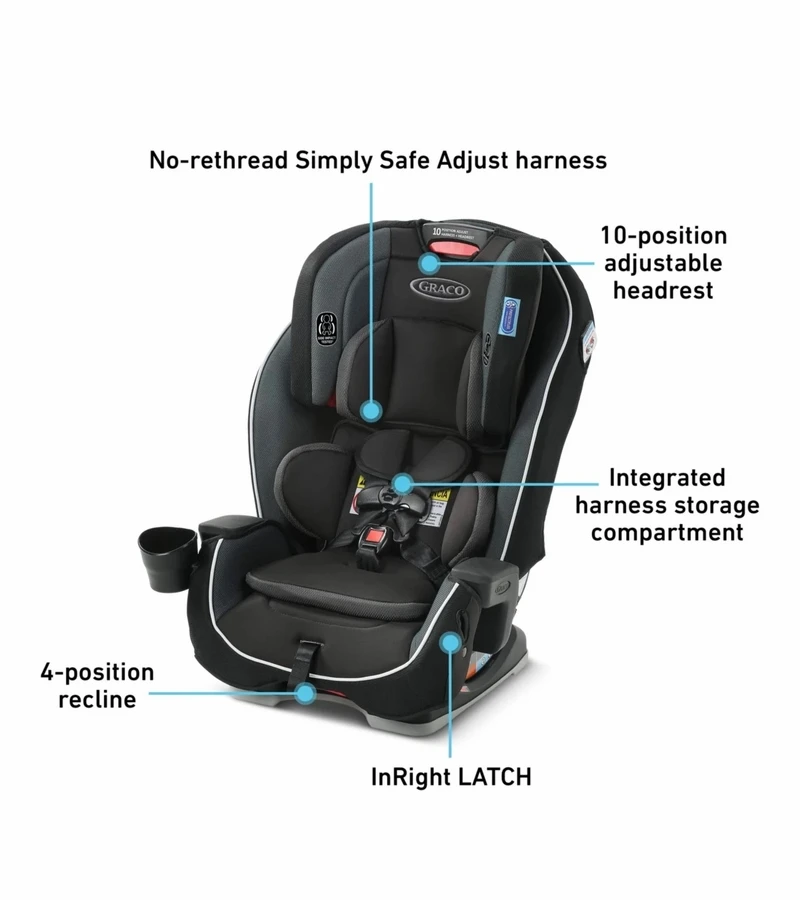 - No-Rethread Simply Safe Adjust™ Harness System allows the headrest and harness to adjust together in one motion