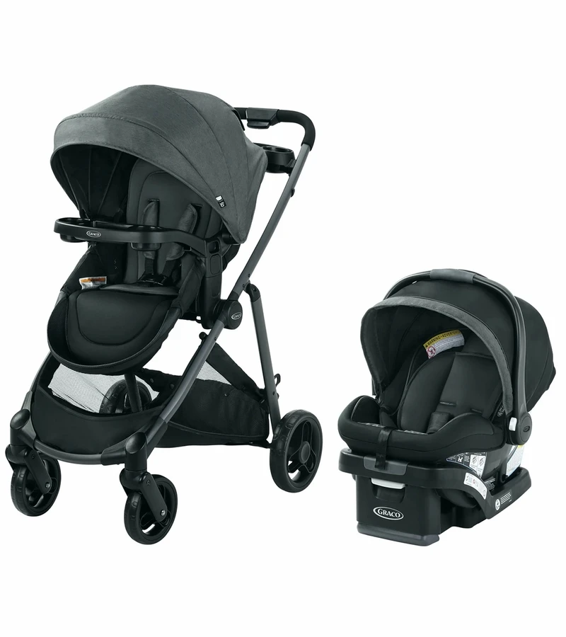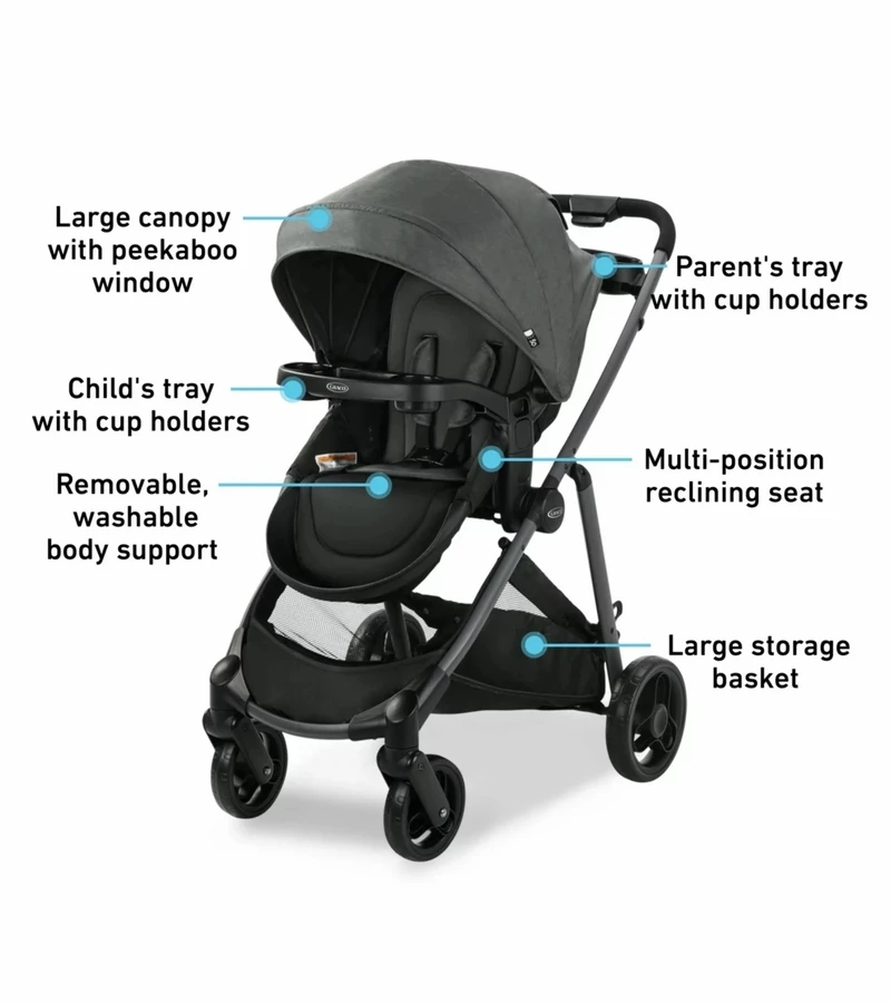 The Graco® Modes™ Element DLX Travel System is the 3-in-1 stroller that converts from Infant Car Seat Carrier to Infant Stroller to Toddler Stroller for years of strolling together. For even more riding options, baby can ride parent-facing or forward-facing, thanks to a reversible stroller seat. The travel system includes the Graco® SnugRide® SnugLock™ 35 LX Infant Car Seat, rear-facing from 4-35 lb, for seamless transition from car to stroller. A one-hand self-standing fold ensures easy storage at home or when traveling. With Modes™ Element DLX Travel System, you can take all your necessities with you—a parent’s tray with cup holders and removable child’s tray with cup holders keep drinks and snacks at hand, and a large storage basket holds child and parent essentials. Baby is sure to stay comfortable with added body support, a large canopy, seat recline, and a convertible 3- or 5-point harness that grows with your child.