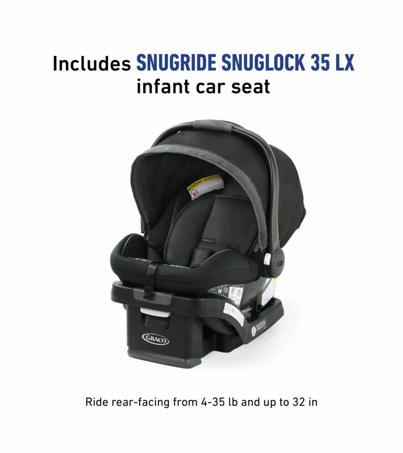 - Includes the Graco® SnugRide® SnugLock™ 35 LX Infant Car Seat, rear-facing for infants from 4-35 lb and up to 32″