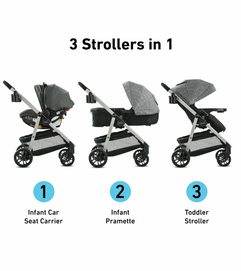 - 3 strollers in 1: Infant Car Seat Carrier, Infant Pramette, and Toddler Stroller to stroll from infant to toddler