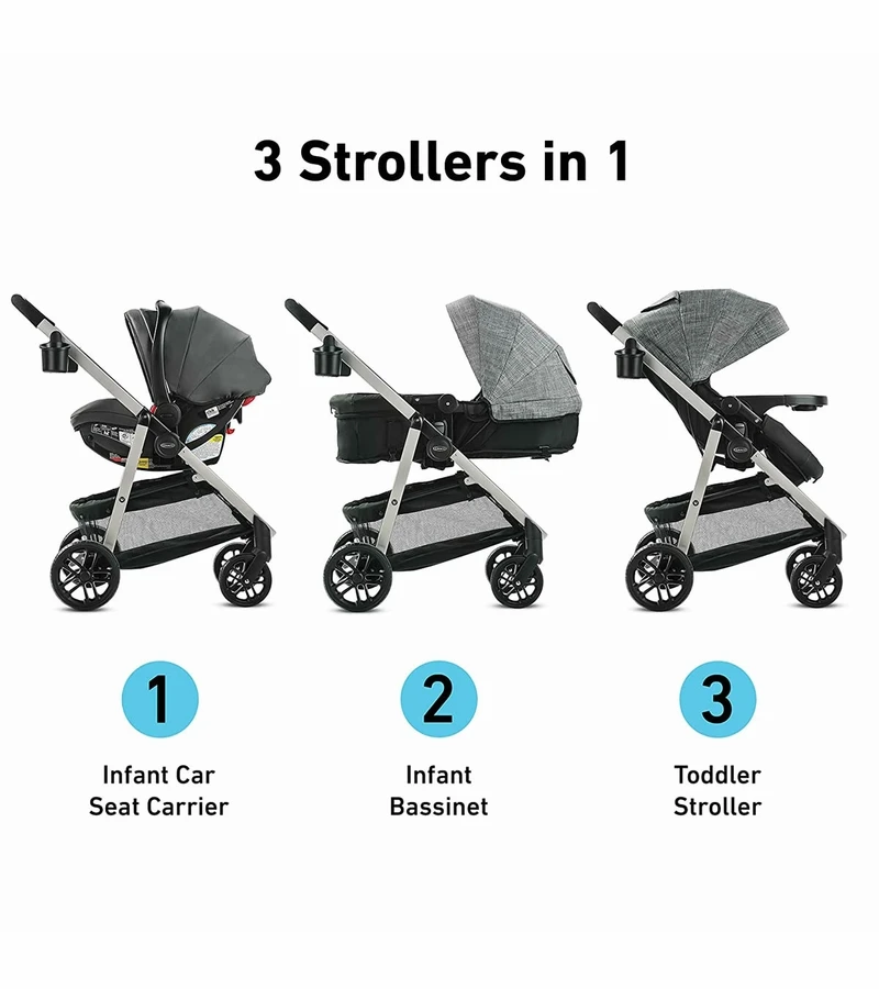 - 3 strollers in 1: Infant Car Seat Carrier, Infant Bassinet, and Toddler Stroller to stroll from infant to toddler
