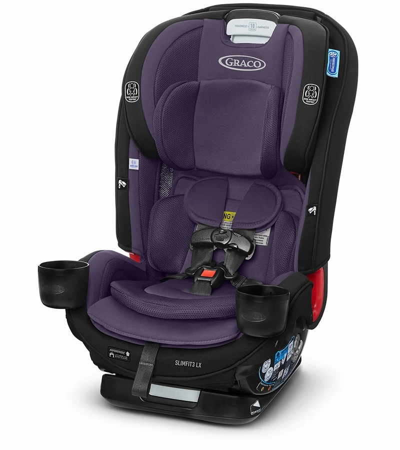 The Graco® SlimFit3™ LX 3-in-1 Car Seat is our slimmest design that fits 3 car seats across, saving space in your back seat without compromising on the safety you trust and the features you need. This narrow all-in-one car seat grows with your child from rear-facing harness (5-40 lb) to forward-facing harness (22-65 lb) to highback booster (40-100 lb). We tested our lightweight 3-across car seat in every configuration, to help ensure your growing family can fit in your vehicle, even with children of different ages who ride in different modes, or when paired with select other Graco car seats. Integrated belt lock-off makes for easy vehicle seat belt installation in forward-facing mode, and allows you to position your seats to maximize space with 3 across. Graco’s exclusive push-button InRight™ LATCH provides an easy, one-second attachment with an audible click to help ensure secure installation. We made thoughtful design choices to make the SlimFit3 easy to adjust with 3 car seats in the back seat. The No-Rethread Simply Safe Adjust™ Harness System allows you to adjust the height of the headrest and harness to 10 positions with just one motion for just the right fit. Easily adjust the 4-position recline for a better installation and a comfortable ride. The Rapid Remove cover comes off in 60 seconds, without uninstalling the seat or removing the harness, and is machine washable. Plus, the SlimFit3™ is slim enough to fit 3 across, but spacious enough to keep your growing child comfy. Breathable mesh AirFlow channels provide improved ventilation to keep your child cool and comfortable. Two cup holders are designed to work with the three-across configuration to keep drinks and snacks close at hand. Fuss-free harness storage pockets conveniently hold the harness out of the way while your child gets in and out. Removable, plush head and body inserts help to keep your infant feeling cradled and comfortable. The steel-reinforced frame provides strength and durability for years of use, and EPS energy-absorbing foam provides effective impact energy management. This car seat is Graco® ProtectPlus Engineered™ to help protect in frontal, side, rear, and rollover crashes.