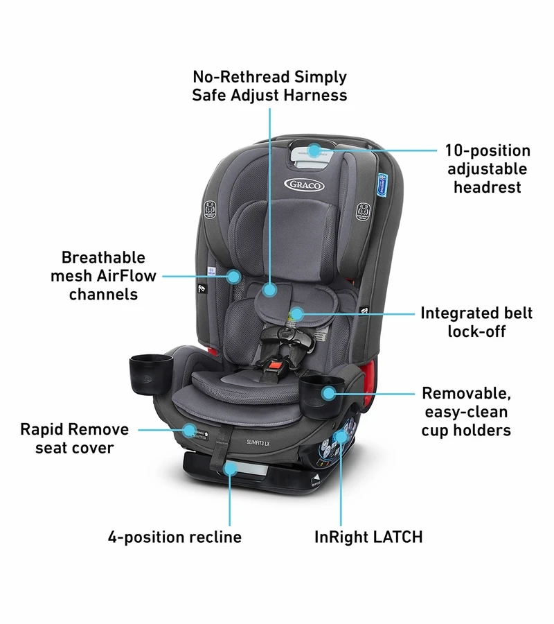 The Graco® SlimFit3™ LX 3-in-1 Car Seat is our slimmest design that fits 3 car seats across, saving space in your back seat without compromising on the safety you trust and the features you need. This narrow all-in-one car seat grows with your child from rear-facing harness (5-40 lb) to forward-facing harness (22-65 lb) to highback booster (40-100 lb). We tested our lightweight 3-across car seat in every configuration, to help ensure your growing family can fit in your vehicle, even with children of different ages who ride in different modes, or when paired with select other Graco car seats. Integrated belt lock-off makes for easy vehicle seat belt installation in forward-facing mode, and allows you to position your seats to maximize space with 3 across. Graco’s exclusive push-button InRight™ LATCH provides an easy, one-second attachment with an audible click to help ensure secure installation. We made thoughtful design choices to make the SlimFit3 easy to adjust with 3 car seats in the back seat. The No-Rethread Simply Safe Adjust™ Harness System allows you to adjust the height of the headrest and harness to 10 positions with just one motion for just the right fit. Easily adjust the 4-position recline for a better installation and a comfortable ride. The Rapid Remove cover comes off in 60 seconds, without uninstalling the seat or removing the harness, and is machine washable. Plus, the SlimFit3™ is slim enough to fit 3 across, but spacious enough to keep your growing child comfy. Breathable mesh AirFlow channels provide improved ventilation to keep your child cool and comfortable. Two cup holders are designed to work with the three-across configuration to keep drinks and snacks close at hand. Fuss-free harness storage pockets conveniently hold the harness out of the way while your child gets in and out. Removable, plush head and body inserts help to keep your infant feeling cradled and comfortable. The steel-reinforced frame provides strength and durability for years of use, and EPS energy-absorbing foam provides effective impact energy management. This car seat is Graco® ProtectPlus Engineered™ to help protect in frontal, side, rear, and rollover crashes.
