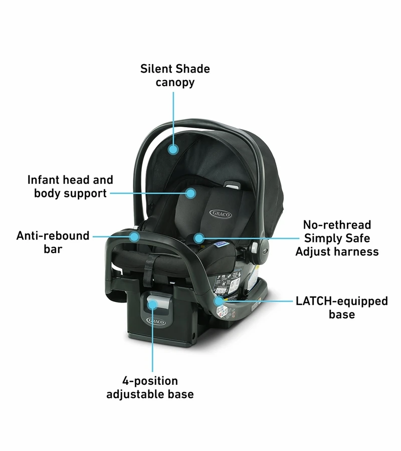 Graco® SnugRide® SnugFit™ 35 Infant Car Seat features an Anti-Rebound Bar, which provides an additional layer of rear-facing safety by limiting rotation of the seat and your child in the event of an impact. SnugRide® performance helps to protect rear-facing infants from 4-35 lb and up to 32″. From the makers of SnugRide®, the SnugFit™ line of infant car seats pairs safety technologies with easy installation and comfort features for your little one. The headrest and harness can be adjusted together while your child is in the seat with the front-adjust No-Rethread Simply Safe Adjust™ Harness System. The 4-position adjustable base and an easy-to-read pendulum level indicator help with proper installation. Infant head and body supports offer a comfortable fit. The Silent Shade™ canopy adjusts quietly without disturbing baby. Create your own travel system or use in multiple cars: The SnugRide® SnugFit™ 35 attaches with a one-step secure connection to Graco® strollers and infant car seat bases. The car seat is Graco® ProtectPlus Engineered™ to help protect in frontal, side, rear, and rollover crashes.