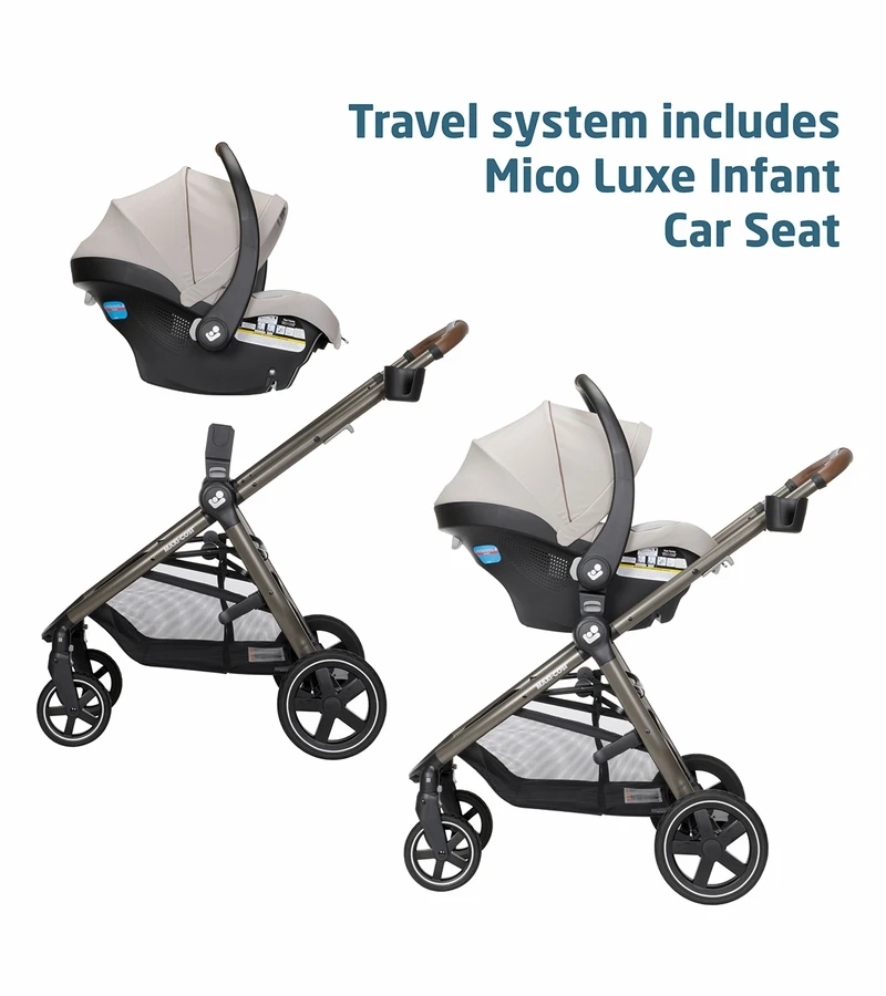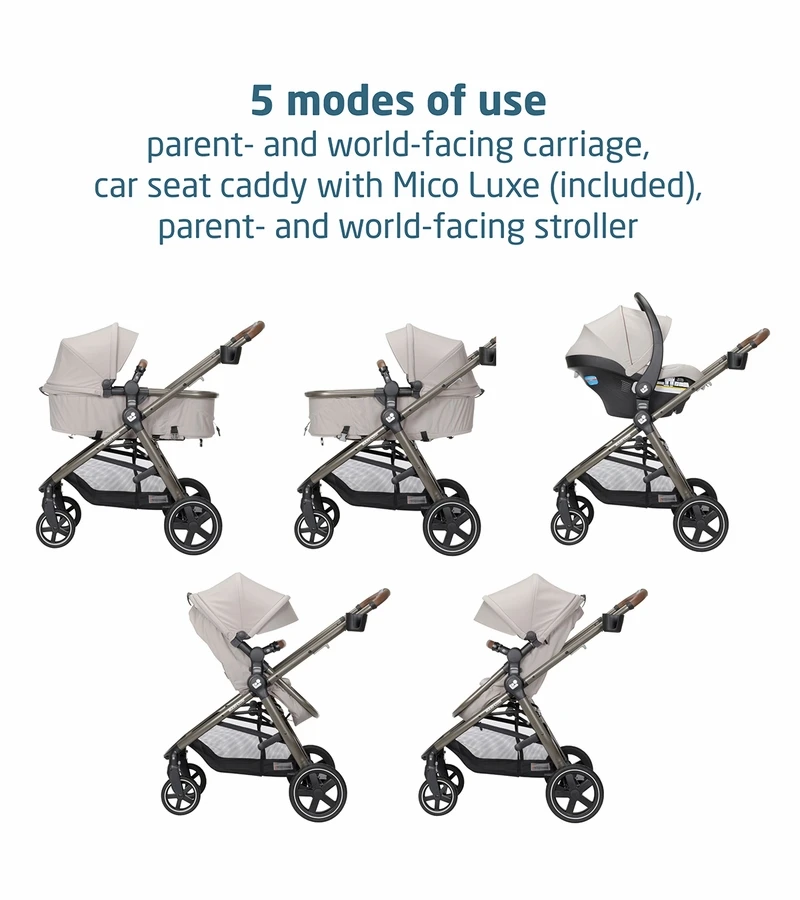 The ZeliaTM2 Luxe 5-in-1 Modular Travel System is designed to help you stroll into parenthood with ease. So versatile, you can step out with your baby from day 1 and be prepared to journey through years of adventures together. Transition smoothly between 5 modes: switches easily between parent-facing car seat caddy, reversible carriage, and reversible stroller. The included lightweight Mico Luxe Infant Car Seat is made for safety plus coziness for your baby with Side Impact Protection (SIP), removable plush infant inserts, and premium PureCosi™ fabrics that keep your little one comfy, yet can be removed quickly without the need to rethread the harness when it’s time to machine wash and dry them. Vegan-leather accents on the stroller and car seat add style and comfort.
