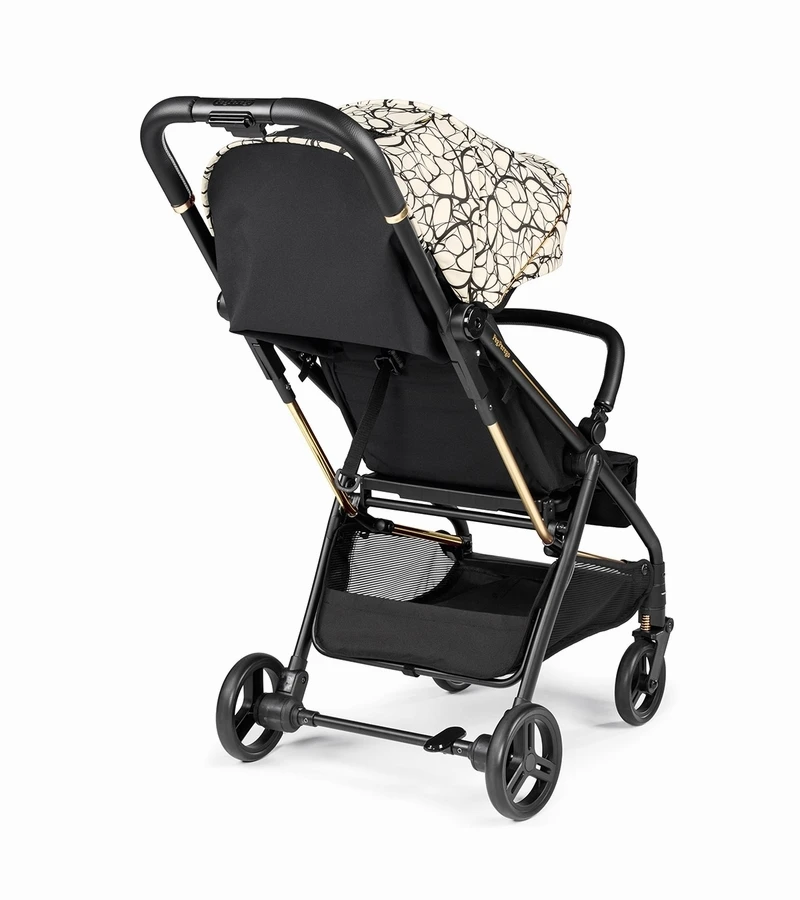 The stroller features selfie-worthy fashions, including a gold frame on the Graphic Gold and Mon Amour colors, and an eco-leather handlebar and bumper bar details.